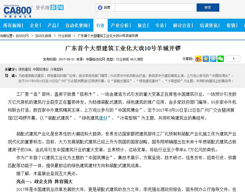 中國鋼結(jié)構(gòu)資訊網(wǎng)發(fā)布有關2017中國筑博會·廣州開幕式的報道 (2017-10-30)