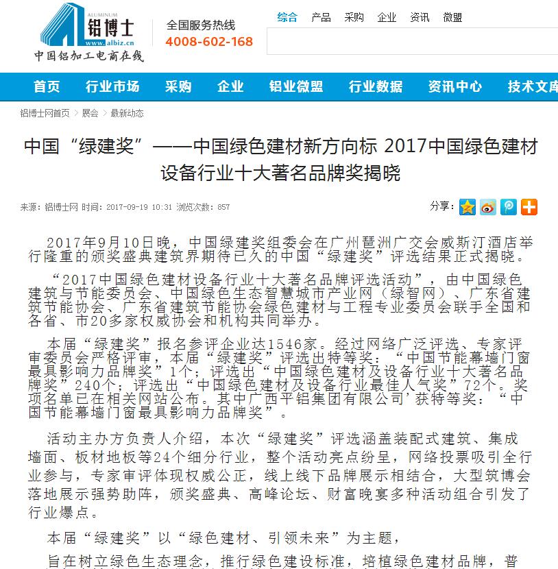 綠建之窗網(wǎng)發(fā)布有關(guān)2017中國綠色建材設(shè)備行業(yè)十大著名品牌獎的報(bào)道 (2017-10-31)