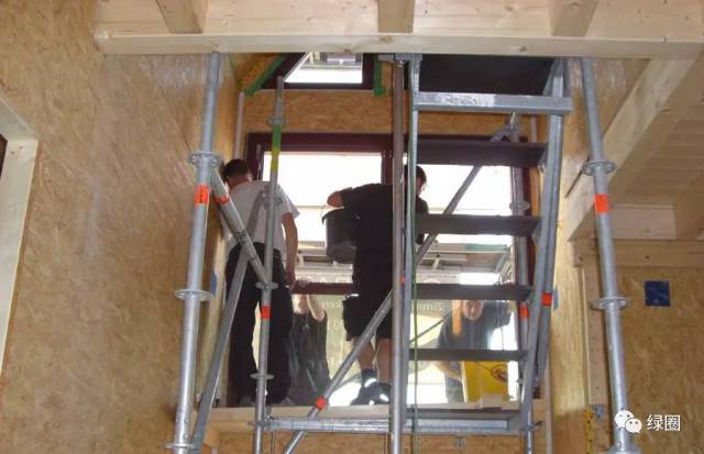 然后進行預制墻體、樓板及屋頂構(gòu)件的吊裝。這些構(gòu)件可以是木制的、輕鋼的、甚至塑料PVC的,但它們有一個共同的特點,外部結(jié)構(gòu)板材里夾裝著厚實的保溫層。這些保溫層都是A級防火、永久不燃的玻璃棉或巖棉組成。確保保溫隔熱的同時,加強房屋的防火性。