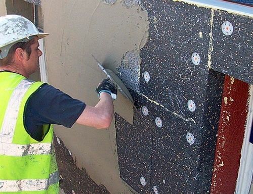 上面這個案例中采用的保溫板為擠塑板。擠塑板比聚苯板保溫和強(qiáng)度都更好,但表面可粘性不佳,圖上可以看出工人特地將擠塑板表面劃出一道道痕跡,增強(qiáng)抹面層的粘結(jié)性。不過這種網(wǎng)格布干鋪施工的做法,放在國內(nèi)也是不合格的施工工藝。