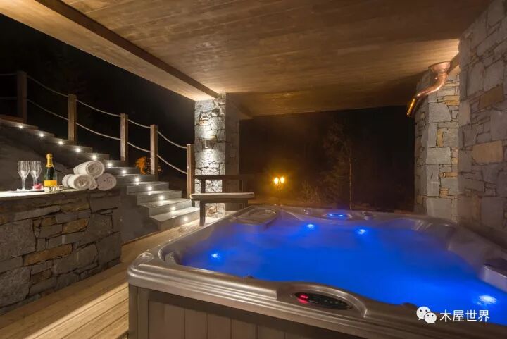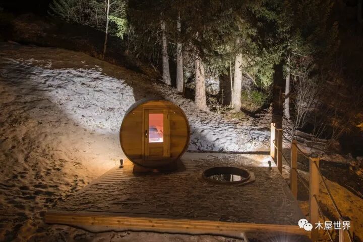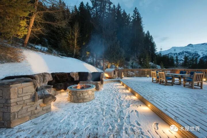 打開門可進入到一個巨大的露臺,有篝火坑,露天熱水浴缸,桶桑拿,跳水池,當(dāng)然還有壯麗的山景欣賞。