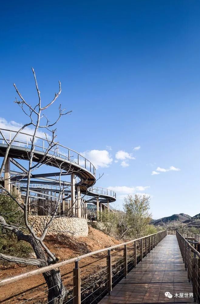 為了軟化直線和方形的空間構(gòu)圖,設(shè)計師在觀景棧道部分使用了柔和的曲線設(shè)計,打造出一個流動蜿蜒的云形連廊。它在兩個不同高度之間形成連接,優(yōu)化了空間和景觀的層次,同時借此埋下伏筆,體現(xiàn)出設(shè)計師鄒迎晞主張的“有無相生”設(shè)計哲學(xué)。屋頂露臺、觀景平臺以及木棧道之間形成一個龐大的棧道游覽體系。四周幾乎盡數(shù)保留了當(dāng)?shù)卦胁煌锓N的樹木,游人穿行期間,四季均有果實成熟,將是一個不斷發(fā)現(xiàn)驚喜的過程。