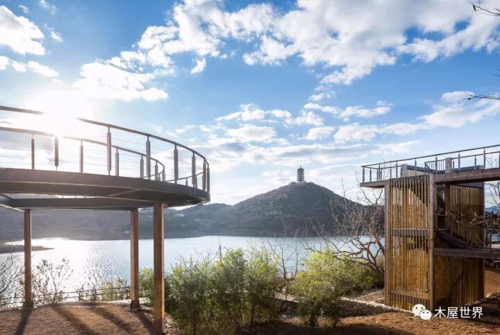 同時在半島視野最為開闊的位置打造出及功能性與視覺體驗于一體的標(biāo)志建筑——觀景餐廳和天空觀景臺。這個新建內(nèi)容在湖岸與酒店居住區(qū)之間的半坡位置,形成游與居之間的小憩之所。餐廳與周邊植物共生,以更貼近的方式感受北方四季分明的生態(tài)變化。餐廳屋頂跟隨建筑群整體風(fēng)格,是平層、見方的空曠露臺。向上延伸,與整體建筑的自然調(diào)性相融合,同時又通過屋頂不同于半島其它建筑形態(tài)建造的玻璃觀景臺,讓陽光、視野360度無礙放開,為游覽者創(chuàng)造出舒展于“野”,自由呼吸的體驗。