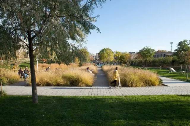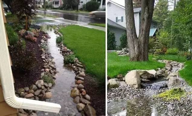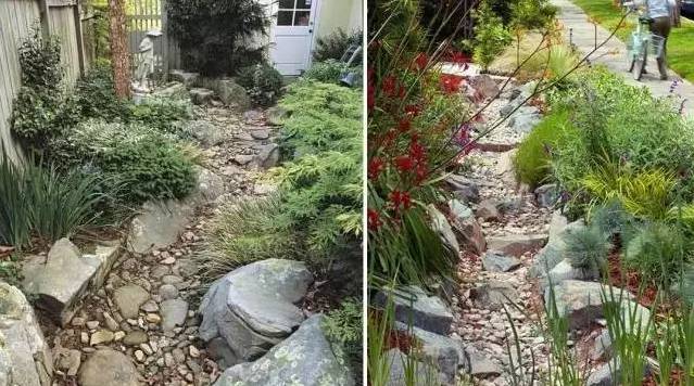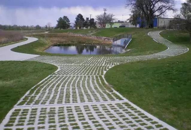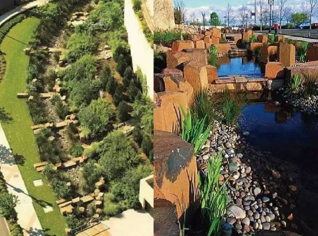 [以控制雨洪為目的 ] 這一類的雨水花園主要起到滯留與滲透雨水的目的,結構相對簡單。一般用在環(huán)境較好、雨水污染較輕的地域,如居住區(qū)等。 [以降低徑流污染為目的] 這個類型的雨水花園適用于環(huán)境污染相對嚴重的地域,如城市中心、停車場等地。由于要去除雨水中的污染物質,因此在土壤配比、植物選擇以及底層結構上需要更嚴密的設計。 在實際的應用過程中,雨水花園還會以以下幾種形式出現(xiàn): 1 植草溝 2 下沉式綠地 3 樹池 來個簡單直接的動圖,看清雨水花園的工作原理 ▼ 許多雨水花園都會在其中設置地表徑流,但并不是單純做個水景,因為如果該地區(qū)長期沒有降水,這樣的溝渠沒有水流動時就無法保證其觀賞性,所以在設計的時候還會考慮到干旱時期的景觀性。 道路的基礎要盡量少用混凝土,因為混凝土透水性弱,滲透緩慢,無法及時有效地消耗掉過多的水量,因此道路面材要選用透水良好的材料,如透水磚。 也可以采用純粹的碎石鋪地或者適當運用植草磚,這樣可以最大程度滲透水。