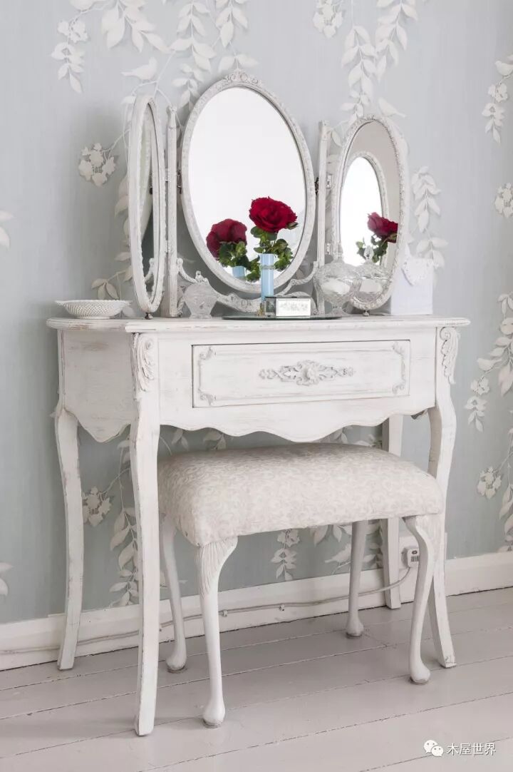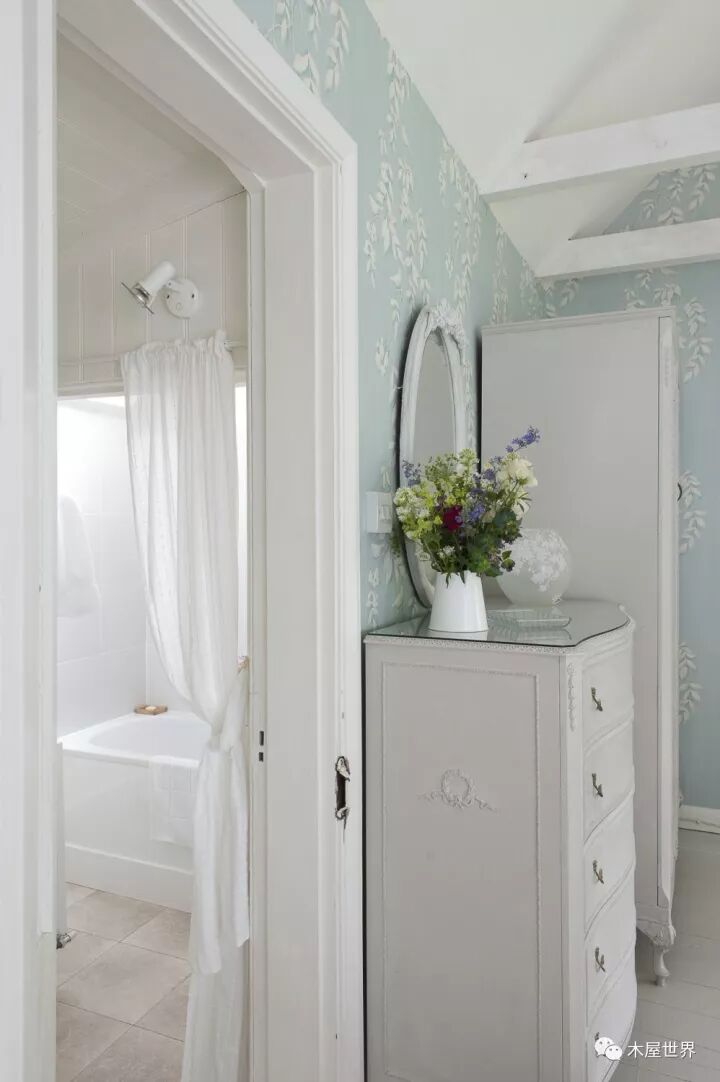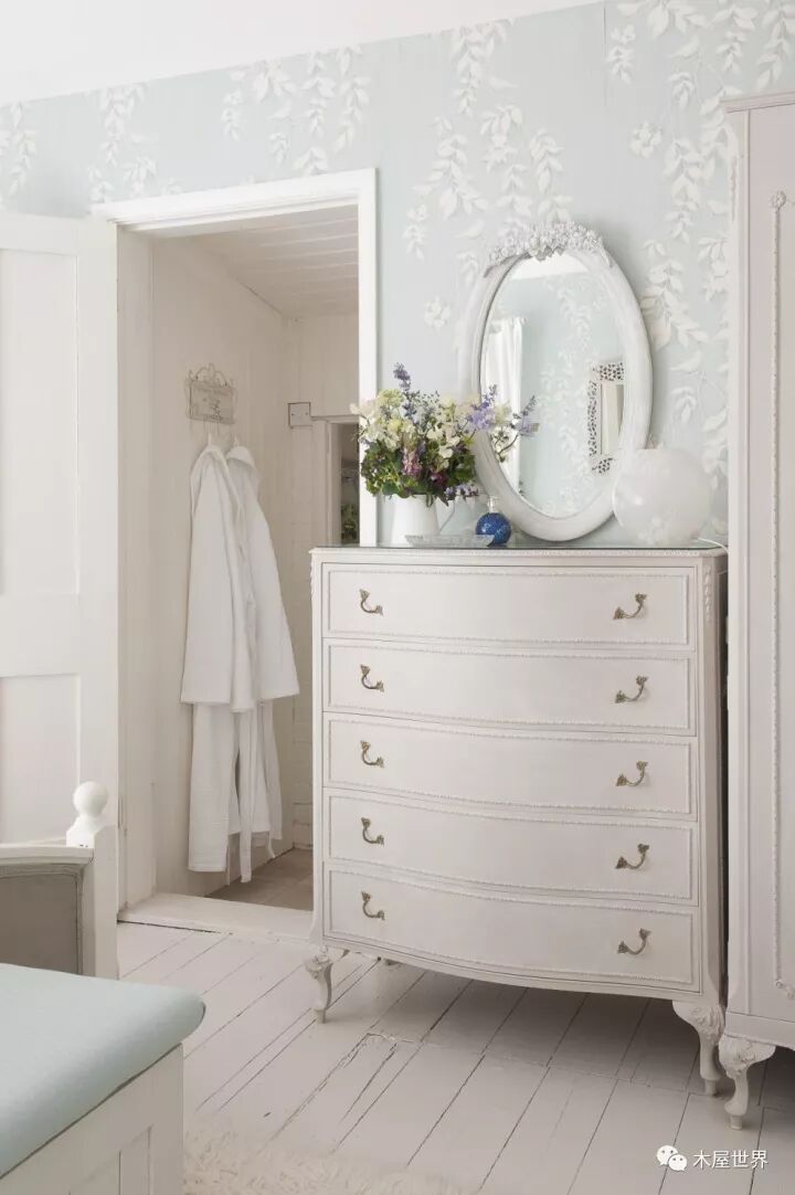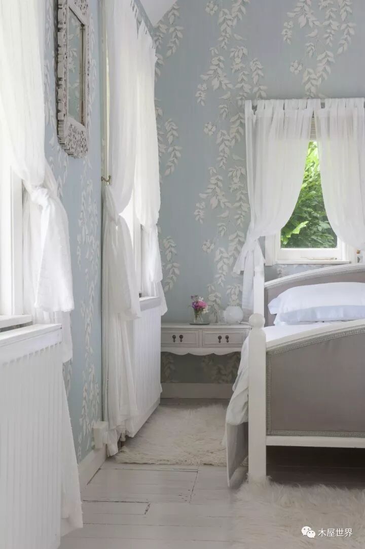 直接在客廳旁邊的臥室是一個(gè)藍(lán)色的勞拉·阿什利(Laura Ashley)印刷品,“看起來像尼娜·坎貝爾(Nina Campbell)手繪墻紙,但是價(jià)格只有它的十分之一”。窗戶上是來自宜家的雪白的平紋細(xì)布的浪漫窗簾。