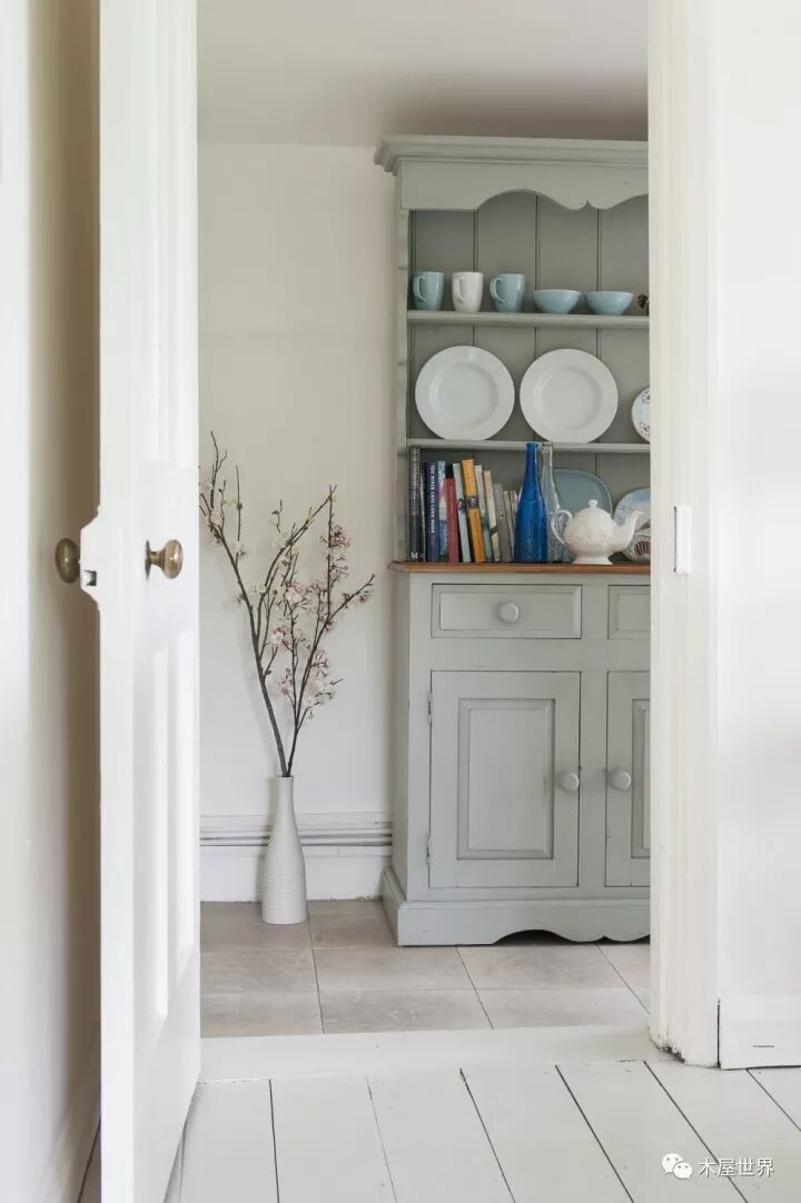 她選擇了 Wimbourne 白色為客廳墻壁的顏色和微妙的鴿子灰色的 Skimming 石板為地板。在凸窗里是她發(fā)現(xiàn)的馬克·梅納德(Mark Maynard)的桌子。“那只是一張古舊的松木桌子,我彩繪了桌腿,在上面涂上了丹麥油。”