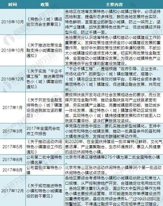 2016年10月14日,住建部公布了第一批127個中國特色小鎮(zhèn)名單;2017年8月,住建部公布第二批中國特色小鎮(zhèn)名單;2016年10月與2017年1月,住建部分別與農(nóng)發(fā)行、國開行等政策性銀行簽署合作協(xié)議,將給特色小鎮(zhèn)建設(shè)提供政策性金融支持;2017年12月,發(fā)改委、國土部、環(huán)保部、住建部出臺《關(guān)于規(guī)范推進特色小鎮(zhèn)和特色小城鎮(zhèn)建設(shè)的若干意見》,規(guī)范特色小鎮(zhèn)的建設(shè),防止變形走樣。