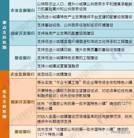 特色小鎮(zhèn)的金融支持政策能夠指導(dǎo)地方特色小鎮(zhèn)的建設(shè)規(guī)劃和項目投融資創(chuàng)新,確保項目資金落地,全面提升小城鎮(zhèn)建設(shè)水平和發(fā)展質(zhì)量。綜合各大銀行政策的支持范圍包括重點支持項目和優(yōu)先支持項目。