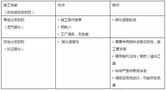 密封膠可分為單組分和雙組分兩種,以改性硅烷膠為例,單、雙組分密封膠的施工性能對比如下表: