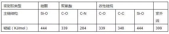 各類型密封膠的主鏈結(jié)構(gòu)及鍵能和紫外線能量對比如下表: