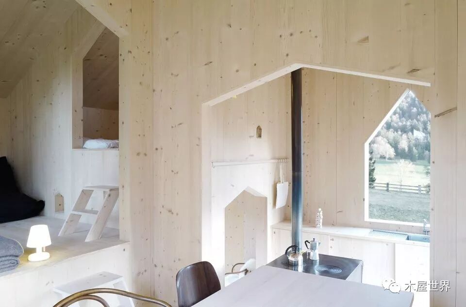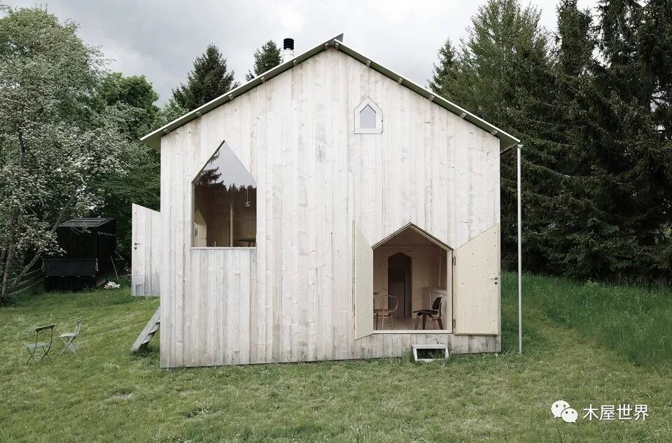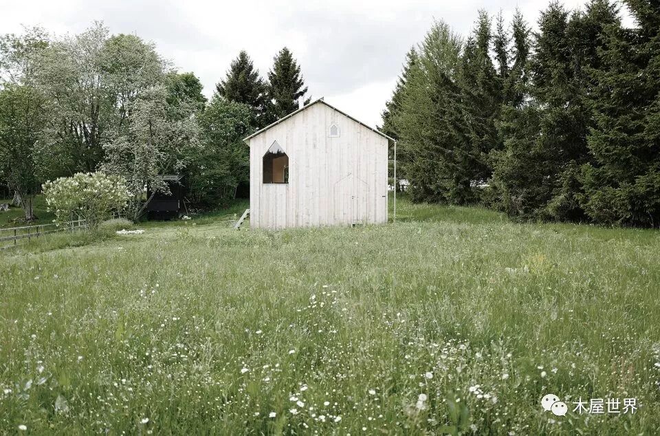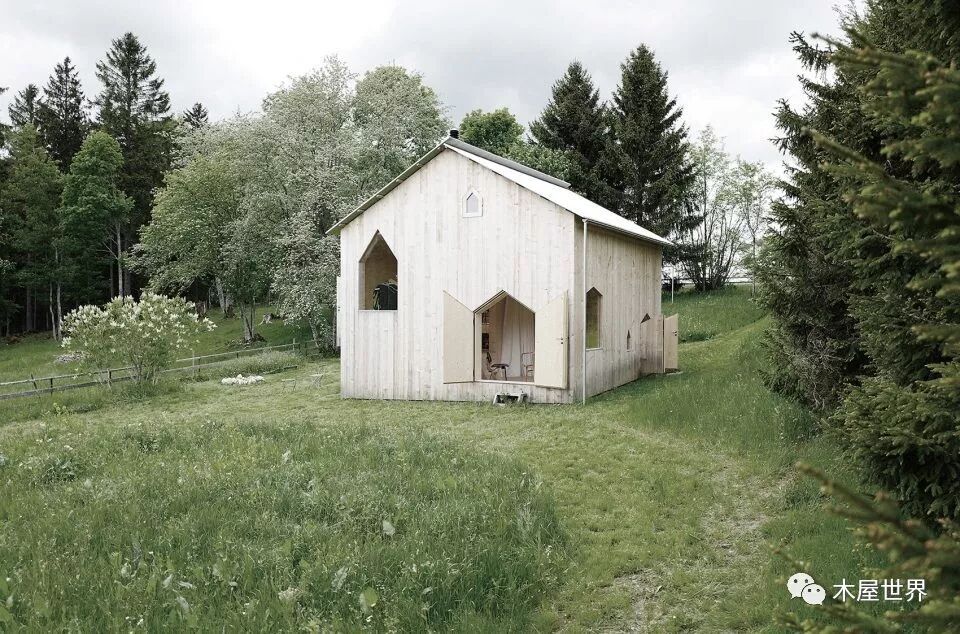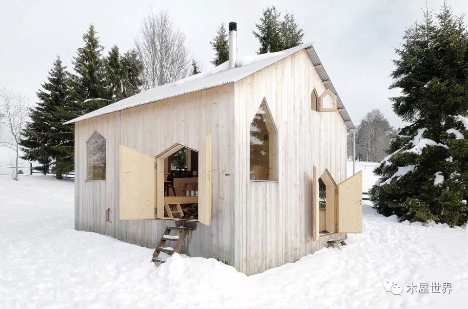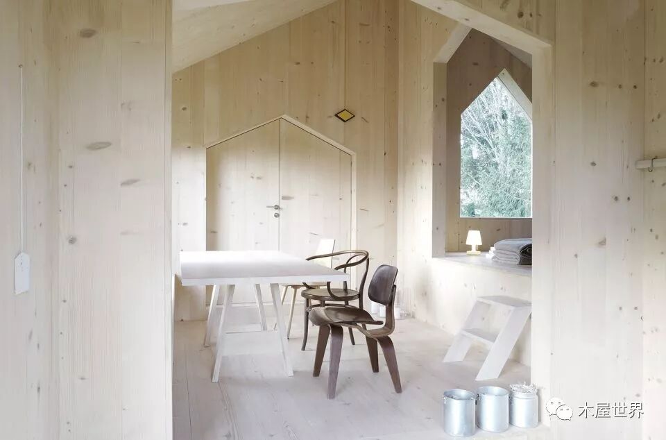 房子被山形屋頂?shù)奈菁怪敢较颉m?xiàng)目沒有特定的入口,或者說它從四個(gè)方向都可獲得基地的自然資源。因此,到訪者可以從多個(gè)部分進(jìn)入或離開。這個(gè)小屋完全使用木頭建造的,使用了來自侏羅森林的杉木板材,外部保留木材被鋸后粗糙的痕跡,內(nèi)部刨平,垂直地釘在門面和內(nèi)墻的支撐結(jié)構(gòu)上。同樣的木板,邊縫凹槽處理,覆蓋住托梁,構(gòu)成地板和天花板。特別折疊制成的單片不銹鋼板像一張紙一樣蓋住屋頂,賦予了小屋更多柔弱的質(zhì)感。一個(gè)托盤連接著一排水槽收集雨水。小屋做到百分之一百的能源自給自足,沒有與任何配電網(wǎng)連接。這個(gè)建造實(shí)驗(yàn)用不同的主題來個(gè)性化我們的建筑:形式的簡單與同質(zhì)性,空間的多樣與豐富性,中性和表達(dá)性的奇點(diǎn),以及從形式構(gòu)成中散發(fā)出來的平靜、柔和與輕盈。