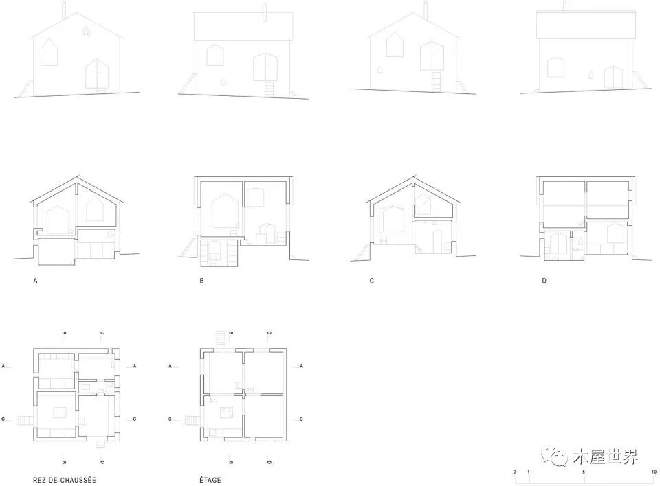 Chalet in Brot-Plambozshi 是位于瑞士Neuchatel的極簡主義住宅,由frundgallina設(shè)計(jì)。呼應(yīng)著四個(gè)方向上都很美麗的自然景觀,住宅由四個(gè)大小相同的部分組成,每個(gè)約占地8平方米。這四個(gè)“鄰居”從高度上被分割,精確地對應(yīng)著它們的入口。這些不同高度的“碎片”組成了一個(gè)多樣化的空間。因此,在就農(nóng)舍所劃定的空間內(nèi),四個(gè)面中的三個(gè)可在兩個(gè)高度上組織空間,從而獲得總共七個(gè)特殊用途的空間。這些“房間”通過大中小不同的開口連接在一起,形成了一個(gè)有趣的螺旋形的漫步,并能保證使用者持續(xù)地感知整個(gè)室內(nèi)空間,同時(shí)通過強(qiáng)烈的感官區(qū)分隔開彼此。每一個(gè)立面都有一個(gè)大窗戶和一個(gè)小窗戶,同時(shí)有一個(gè)通向室外的雙開門。墻壁被切割成不同的高度,從而讓參觀者知曉內(nèi)部空間的組織邏輯。
