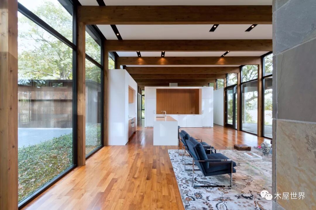 設(shè)計(jì)團(tuán)隊(duì)在整個(gè)住宅中采用核桃木作為飾面材料,未做吊頂處理,同時(shí)輔以低調(diào)的白色墻壁,所有這一切都是為了加強(qiáng)住宅與環(huán)境之間的關(guān)系。