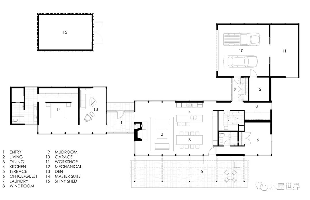 廚房外有洗衣房、酒窖和一間小辦公室。最后一個(gè)體量在住宅的東北,里面是車庫(kù)和工作間。