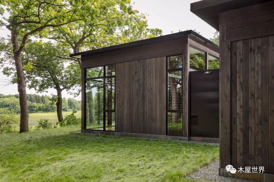 該建筑由三個(gè)呈直線排列的翼?yè)ЫM成,位于石材基座之上。在外墻上,深色的雪松木與巨大的玻璃面相結(jié)合,視線從入口處就能穿透房間看向后院。