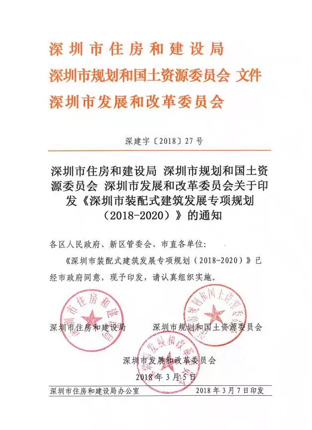 2018年3月7日,深圳市住房和建設(shè)局 深圳市規(guī)劃和國土資源委員會 深圳市發(fā)展和改革委員會印發(fā)《深圳市裝配式建筑發(fā)展專項規(guī)劃(2018-2020)》(深建字〔2018〕27號 ) 。