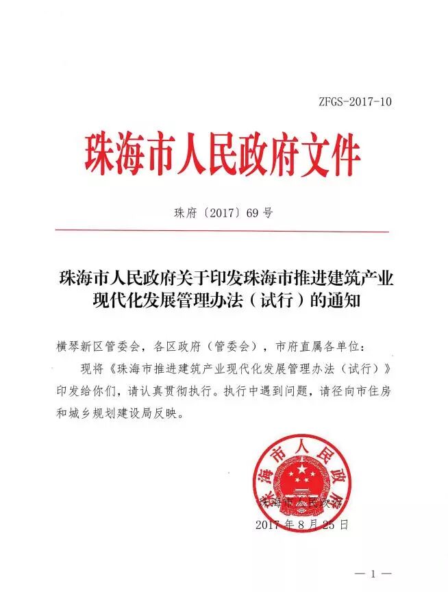 2017年8月25日,珠海市人民政府印發(fā)《關(guān)于推進建筑產(chǎn)業(yè)現(xiàn)代化發(fā)展管理辦法(試行)的通知》(珠府〔2017〕69號 ) 。