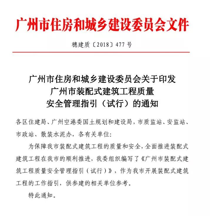 2018年3月30日,廣州市住房和城鄉(xiāng)建設(shè)委員會印發(fā)《廣州市裝配式建筑工程質(zhì)量安全管理指引(試行)》(穗建質(zhì)〔2018〕477號 ) 。