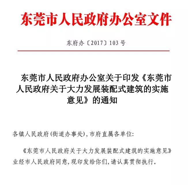 2017年8月3日,東莞市人民政府辦公室印發(fā)《東莞市人民政府關(guān)于大力發(fā)展裝配式建筑的實施意見》(東府辦〔2017〕103號) 。