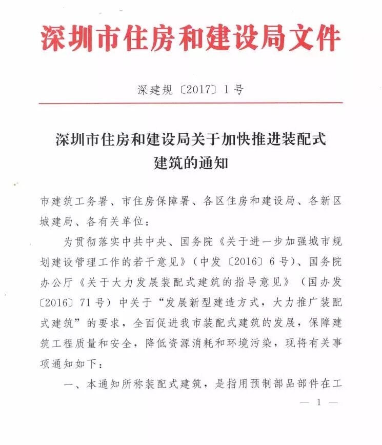 2017年1月12日,深圳市住建局印發(fā)《深圳市住房和建設(shè)局印發(fā)關(guān)于加快推進裝配式建筑的通知》(深建規(guī)〔2017〕1號) 。