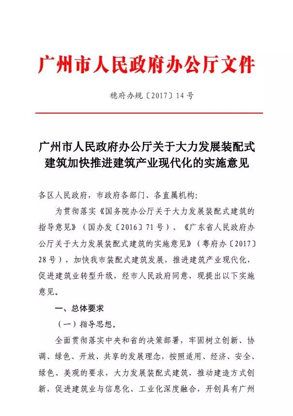 2017年9月19日,《廣州市人民政府辦公廳關(guān)于大力發(fā)展裝配式建筑加快推進建筑產(chǎn)業(yè)現(xiàn)代化的實施意見》(穗府辦規(guī)〔2017〕14號 ) 正式印發(fā)。