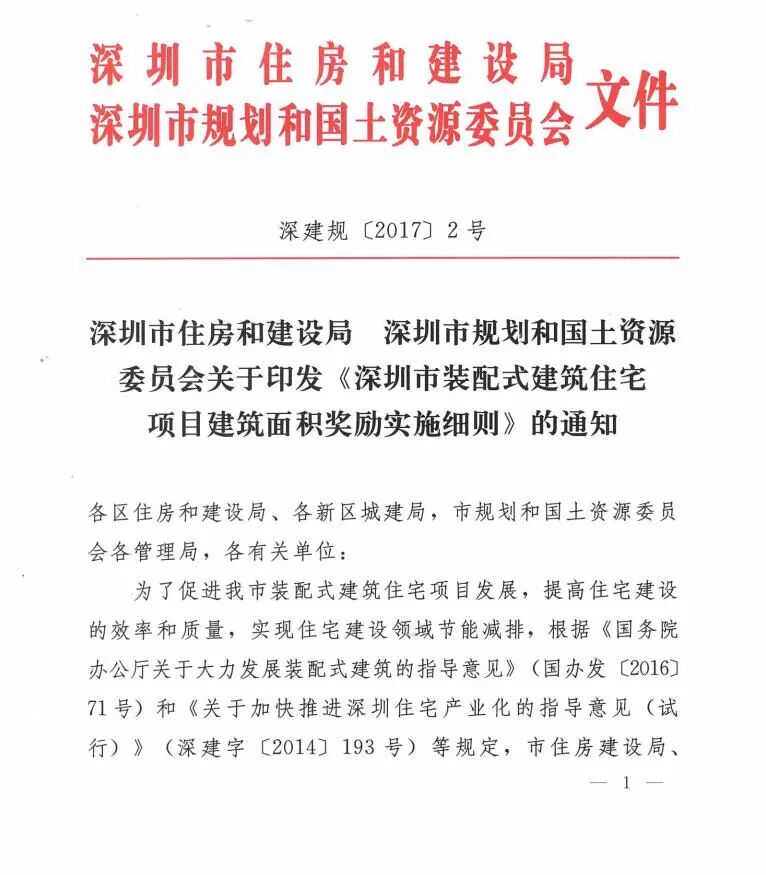 2017年1月20日,深圳市住房建設(shè)局、市規(guī)劃國土委組織制定了《深圳市裝配式建筑住宅項目建筑面積獎勵實施細則》(深建規(guī)〔2017〕2號 ) 。