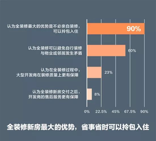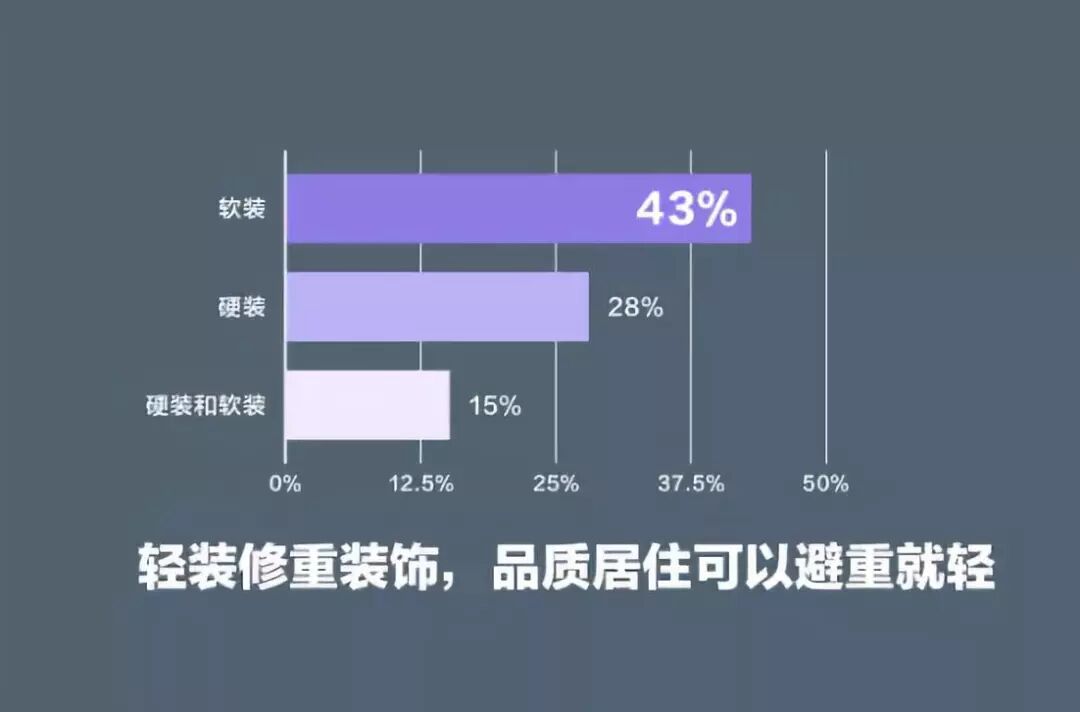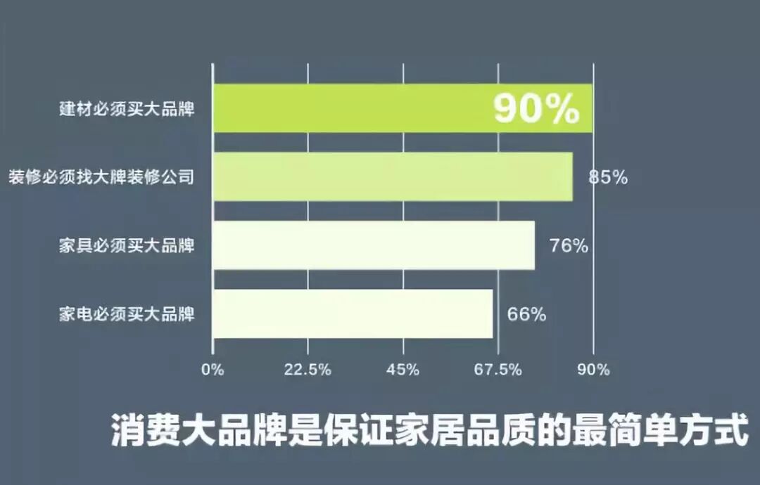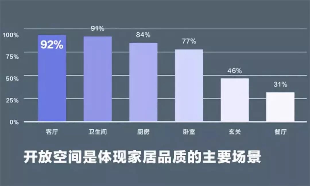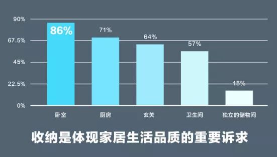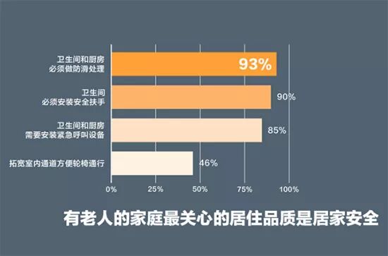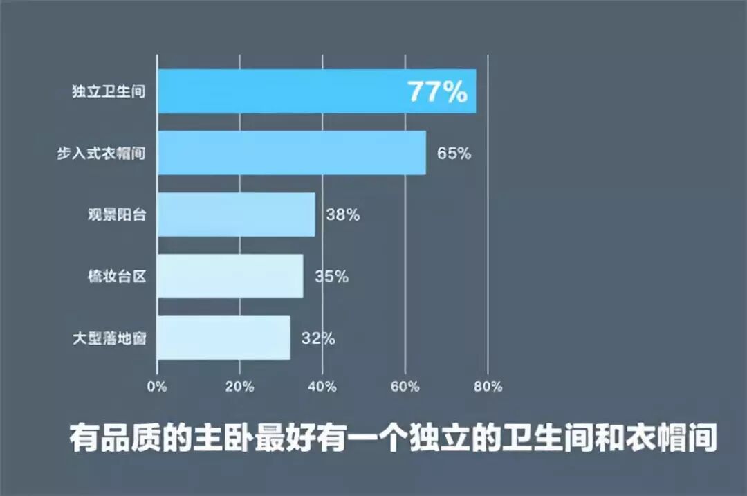 46%的受訪者喜歡典雅新中式風(fēng)格; 35%的受訪者喜歡自然日式風(fēng)格; 30%的受訪者喜歡冷淡北歐風(fēng)格; 15%的受訪者喜歡浪漫地中海風(fēng)格; 15%的受訪者喜歡清新田園風(fēng)格風(fēng)格; 13%的受訪者喜歡豪華歐美風(fēng)格; 5、 輕裝修重裝飾,品質(zhì)居住可以避重就輕 在毛坯房時代,不少人會將重金投資在基礎(chǔ)裝修工程上,認(rèn)為只有底層裝修做好才能讓日后長期的居住更有品質(zhì)保障,然而現(xiàn)在已經(jīng)進入全裝修時代,新房在交付的時候基礎(chǔ)裝修已經(jīng)做好了,所以在自己精裝修時業(yè)主不需要再將大量的預(yù)算耗費在基礎(chǔ)裝修上,于是軟裝成了在居住品質(zhì)上拉開差距的一種方式 。 43%的受訪者認(rèn)為軟裝更能體現(xiàn)家居品質(zhì)感; 28%的受訪者認(rèn)為硬裝更能體現(xiàn)家居品質(zhì)感; 15%的受訪者認(rèn)為硬裝和軟裝都很重要; 6、 消大品牌是保證家居品質(zhì)的最簡單方式 調(diào)查發(fā)現(xiàn),大部分消費者在家居消費中依然相信“品牌的力量”,尤其對于專業(yè)性極高的家居裝修,大部分人會首選大牌建材和裝修公司來減少試錯的機會。 90%的受訪者認(rèn)為建材必須買大品牌; 85%的受訪者認(rèn)為裝修必須找大牌裝修公司; 76%的受訪者認(rèn)為家具必須買大品牌; 66%的受訪者認(rèn)為家電必須買大品牌; 7、 有老人的家庭最關(guān)心的居住品質(zhì)是居家安全 中國開始漸漸步入老齡化社會,有老人的家庭也越來越多,普通的家居環(huán)境往往不能滿足老年人居住品質(zhì)的需要,適老裝修服務(wù)也許會成為下一個家居熱點。 93%的受訪者認(rèn)為衛(wèi)生間和廚房必須做防滑處理; 90%的受訪者認(rèn)為衛(wèi)生間必須安裝安全扶手; 85%的受訪者認(rèn)為衛(wèi)生間和臥室需要安裝緊急呼叫設(shè)備; 46%的受訪者認(rèn)為需要拓寬室內(nèi)通道方便輪椅通行; 8、有品質(zhì)的主臥最好有一個獨立的衛(wèi)生間和衣帽間 臥室是家中最私密的地方,尤其是主臥一般是不對客人開放的。受房價因素限制,不少人在購房時首選80-90平左右的小兩居,臥室空間功能被弱化,如果要升級主臥功能,不少人還是希望能夠擁有獨立的衛(wèi)生間,這將大大提升主臥的個人隱私功能。