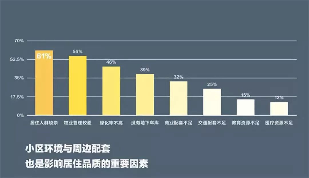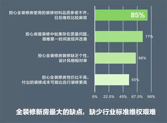65%的受訪者選擇是步入式衣帽間; 38%的受訪者選擇是觀景陽臺; 35%的受訪者選擇是梳妝臺區(qū); 32%的受訪者選擇是大型落地窗; 9、小環(huán)境與周邊配套也是影響居住品質(zhì)的重要因素 古人云“鳥擇木而棲”,小區(qū)環(huán)境對于居住品質(zhì)也有著不可忽視的影響。高尚小區(qū)不僅指房屋品質(zhì)好、小區(qū)景觀美,還有入住居民的素質(zhì)高,甚至周邊的生活配套也需要應(yīng)有盡有,這些方方面面都會影響到居住品質(zhì)和物業(yè)價值。 61%的受訪者表示自己所在小區(qū)居住人群較雜; 56%的受訪者表示自己所在小區(qū)物業(yè)管理較差; 46%的受訪者表示自己所在小區(qū)綠化率不高; 39%的受訪者表示自己所在小區(qū)沒有地下車庫; 32%的受訪者表示自己所在小區(qū)周邊商業(yè)配套不足; 25%的受訪者表示自己所在小區(qū)周邊交通配套不足; 15%的受訪者表示自己所在小區(qū)周邊教育資源不足; 12%的受訪者表示自己所在小區(qū)周邊醫(yī)療資源不足; 10、在外界環(huán)境因素中,噪音污染最影響居住品質(zhì) 居住在喧鬧的城市中,自然環(huán)境不斷被破壞,尤其在人口不斷膨脹的一線城市和新一線城市,不僅空氣和水質(zhì)污染嚴(yán)重,而且同時也要飽受噪音和光污染的困擾。空氣凈化器和凈水器解決了一部分人的家居需要,但是無孔不入的噪音污染還沒有找到更好的辦法來應(yīng)對。 43%的受訪者認(rèn)為最大的環(huán)境污染來自噪音; 38%的受訪者認(rèn)為最大的環(huán)境污染來自空氣; 35%的受訪者認(rèn)為最大的環(huán)境污染來自水質(zhì); 15%的受訪者認(rèn)為最大的環(huán)境污染來自光線; 11 、在強大的智能家居功能中,安防功能最得人心 智能家居的概念已經(jīng)提出了多年,但是要真正實現(xiàn)在尋常人家普及還需要一段時間。智能家居功能強大貌似無所不能,不過就現(xiàn)階段而言,人們最需要的功能是家居的安全防護功能,其次是遙控家中各個電器的功能,安全和便利是人們對智能家居的基礎(chǔ)訴求,也是品質(zhì)居住的根本條件。 80%的受訪者認(rèn)為最需要的智能功能是家居安防功能; 70%的受訪者認(rèn)為最需要的智能功能是電器遙控功能; 57%的受訪者認(rèn)為最需要的智能功能是感應(yīng)聲控功能; 55%的受訪者認(rèn)為最需要的智能功能是預(yù)約定制功能; 28%的受訪者認(rèn)為最需要的智能功能是遠(yuǎn)程監(jiān)控功能; 18%的受訪者認(rèn)為最需要的智能功能是健康管理功能; 12%的受訪者認(rèn)為最需要的智能功能是環(huán)境氛圍功能; 12 、最需要智能設(shè)備的空間是廚房和衛(wèi)生間 廚房和衛(wèi)生間已經(jīng)成為家中智能配置水平最高的兩個空間:智能凈水系統(tǒng)解決了家中全套用水問題,洗碗機解放了主婦們的雙手,智能電烤箱讓烹飪變得如此簡單,智能馬桶也將廁所文明提升了一大步,另外智能門鎖的普及也滿足了人們對于安防的強烈需求。 65%的受訪者認(rèn)為是廚房(凈水系統(tǒng)、洗碗機、電烤箱等); 58%的受訪者認(rèn)為是衛(wèi)生間(浴霸、智能馬桶、緊急呼叫等); 55%的受訪者認(rèn)為是入戶玄關(guān)(智能門鎖、入戶監(jiān)控等); 55%的受訪者認(rèn)為是客廳(掃地機器人、空氣凈化器、家庭影院等); 35%的受訪者認(rèn)為是臥室(感應(yīng)窗簾、氛圍燈光等); 22%的受訪者認(rèn)為是陽臺(晾衣機,洗衣機、烘干機等); 13、目前家中普及率最高的智能產(chǎn)品是凈水器和智能馬桶 雖然全屋智能系統(tǒng)還未大范圍覆蓋普通家庭,但是已經(jīng)有不少智能單品成為家中的“網(wǎng)紅家電”,比如一半以上的家庭已經(jīng)擁有凈水器和智能馬桶(蓋),干衣機、掃地機、洗碗機、電烤箱以及智能門鎖也被越來越的人所接受。凈水器50%;智能馬桶(蓋)50%;干衣機33%;掃地機33%;洗碗機占25%;電烤箱占25%;智能密碼鎖占25%;新風(fēng)空調(diào)占25%; 14、定價超過1萬元的智能家居產(chǎn)品接受度低 智能家電的普及離不開產(chǎn)品的價格因素,超過1萬元以上的智能家居產(chǎn)品消費者接受度大幅降低,其中5000元以內(nèi)的產(chǎn)品市場受歡迎程度很高,隨著智能家居產(chǎn)品越來越普及,產(chǎn)品單價也勢必越來越親民,越來越多性價比更強的智能家居產(chǎn)品將加速智能家居時代的到來。 1000元-5000元60%; 5001元-10000元30%; 1萬元以上20%; 15 、全裝修新房最大的優(yōu)勢,省事省時可以拎包入住 90%的消費者認(rèn)為全裝修最大的優(yōu)勢是不必親自裝修,可以拎包入住; 60%的消費者認(rèn)為全裝修可以避免自行裝修與物業(yè)或鄰居發(fā)生矛盾; 23%的消費者認(rèn)為在全裝修過程中,大型開發(fā)商在裝修質(zhì)量上更有保障; 8%的消費者認(rèn)為全裝修新房交付之后,開發(fā)商的售后服務(wù)更有保障; 16、 全裝修新房最大的缺點,缺少行業(yè)標(biāo)準(zhǔn)維權(quán)艱難 85%的消費者擔(dān)心全裝修房使用的裝修材料品質(zhì)參差不齊,日后維權(quán)比較麻煩; 77%的消費者擔(dān)心房屋裝修中如果存在質(zhì)量問題,很難第一時間發(fā)現(xiàn)并改善; 66%的消費者擔(dān)心全裝修房裝修缺乏個性,設(shè)計風(fēng)格相對單; 55%的消費者擔(dān)心全裝修房性價比不高,付出的裝修成本可能比自行裝修更高;