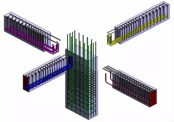 根據(jù)結(jié)構(gòu)設(shè)計圖,創(chuàng)建節(jié)點鋼筋模型,可以檢查預(yù)制構(gòu)件的鋼筋碰撞問題( 圖7) 。預(yù)制柱頂標(biāo)高由截面最高的主梁控制,其他截面稍小的主梁不一定能搭在柱側(cè),在這一步與施工方和深化設(shè)計師共同探討柱頂工具式支架如何設(shè)置。目前的技術(shù)瓶頸在于建立鋼筋三維模型耗時較多,如果這方面更加智能化,則能顯著提高鋼筋構(gòu)造設(shè)計的效率。