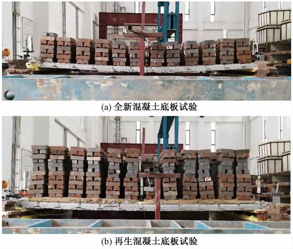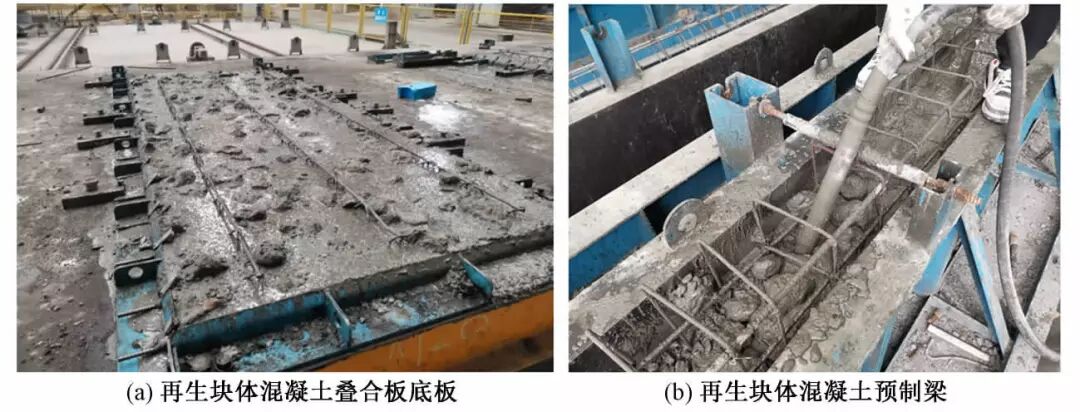 圖 12( a) 為在構(gòu)件廠模臺上生產(chǎn)的再生塊體混凝土疊合板底板,圖 12( b) 為構(gòu)件廠下料振搗中的再生塊體混凝土梁。
