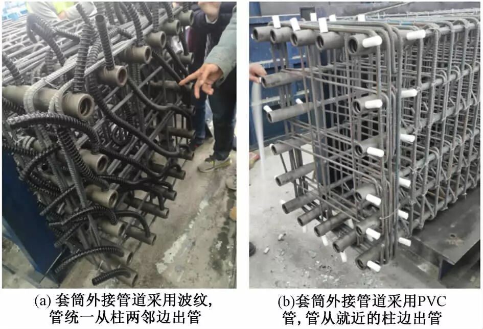 圖4( a) 為套筒外接管道采用波紋管,所有波紋管口都從柱的兩相鄰邊伸出,該方式對于構(gòu)件廠很方便;