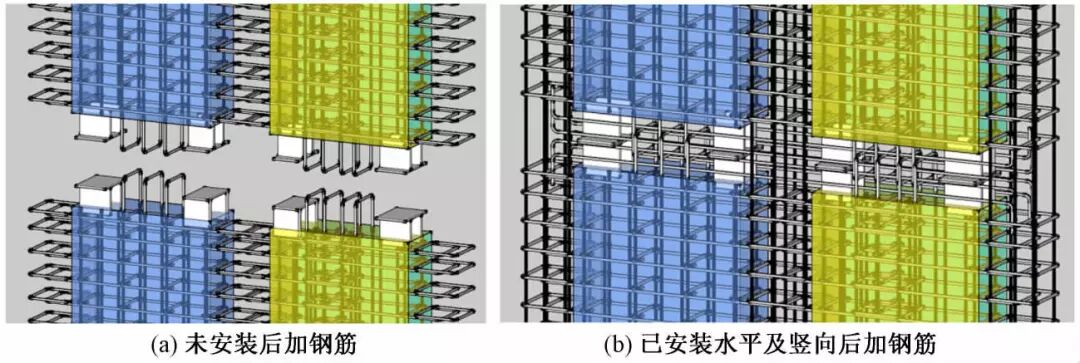 圖5( a) 為上下預(yù)制剪力墻分離示意,未安裝后加鋼筋,圖5( b) 為已安裝水平及豎向后加鋼筋?;阡摻Y(jié)構(gòu)連接方式的預(yù)制混凝土新型連接技術(shù)的優(yōu)點在于鋼結(jié)構(gòu)連接質(zhì)量可檢測,且施工階段無需斜撐,方便后續(xù)裝修施工。