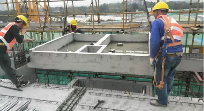 裝配式混凝土建筑工地現(xiàn)場安裝工種除了預(yù)制構(gòu)件安裝工外,一般還有鋼筋工、木工、搭內(nèi)架工和混凝土工,其中鋼筋工的安裝量雖然比傳統(tǒng)現(xiàn)澆工程少,但由于后澆區(qū)域空間狹小,故實際上鋼筋工現(xiàn)場插筋、穿筋安裝困難較多。設(shè)計期間和施工安裝期間,設(shè)計團隊與施工方、構(gòu)件廠配合,不斷優(yōu)化構(gòu)件設(shè)計及安裝工法。