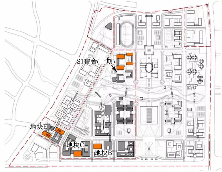 根據(jù)《廣東省人民政府辦公廳關(guān)于大力發(fā)展裝配式建筑的實施意見》、《廣州市人民政府辦公廳關(guān)于大力發(fā)展裝配式建筑加快推進(jìn)建筑產(chǎn)業(yè)現(xiàn)代化的實施意見》,國際校區(qū)一期工程需有至少12萬㎡地上建筑面積的建筑采用裝配式,且達(dá)到不低于A級裝配式建筑評價標(biāo)準(zhǔn)。綜合考慮建筑形體、建筑功能等條件后,國際校區(qū)采用裝配式建筑的單體包括 B,C,E,S 共四個塊的塔樓,建筑面積共計15. 2萬㎡(圖1) ,地上建筑面積13.8萬㎡。其中 B,C,E 地塊4棟塔樓使用功能為教研用房和實驗室,B 地塊醫(yī)藥醫(yī)學(xué)研究院為13層,建筑高度61. 30m; C地塊材料基因中心為15 層,建筑高度64. 40m; E地塊巖土工程研究院為10 層,建筑高度 45. 90m,大數(shù)據(jù)研究院為15層,建筑高度70. 00m。S地塊為4棟學(xué)生宿舍,S1-A1,S1-A2,S1-B1,S1-B2 分別為18,14,12,12 層,其建筑高度分別為 69. 60,54. 80,47. 40,47. 40m。