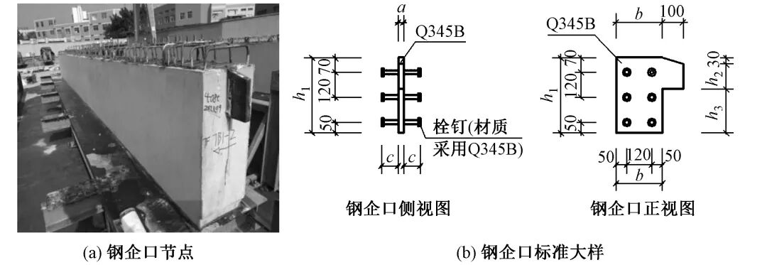大部分次梁為鉸接,采用鋼企口連接方式。圖9( a) 為已生產(chǎn)的構(gòu)件端部節(jié)點,圖9( b) 為鋼企口標(biāo)準(zhǔn)大樣。邊梁或者相鄰洞口的次梁扭矩較大,樓板結(jié)構(gòu)中還有部分連續(xù)次梁的扭矩也較大,采用如圖10所示的端節(jié)點連接方式。