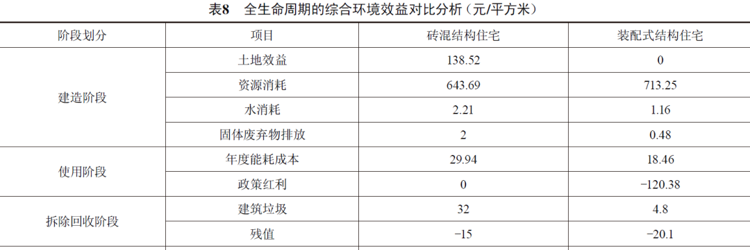 通過裝配式住宅在建造階段、使用階段、拆除回收階段的綜合效益如表8所示。根據(jù)量化分析結(jié)果可知,相比于傳統(tǒng)方式建造的磚混住宅,裝配式住宅在建造階段的土地效益及資源節(jié)約效益顯著;其使用階段享受的政策紅利還能夠帶來效益補(bǔ)償。總體上,裝配式住宅的綜合效益優(yōu)于傳統(tǒng)磚混住宅。