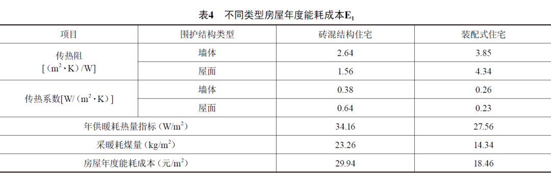 河北屬于北方地區(qū),四季分明,考慮到該項(xiàng)目屬于鄉(xiāng)村,農(nóng)民夏季以自然通風(fēng)為主,基本不采用降溫設(shè)備。因此,該地區(qū)農(nóng)村裝配式住宅的環(huán)境效益主要為冬季采暖能耗所節(jié)約的費(fèi)用。運(yùn)用ENERGYPLUS能耗分析軟件對裝配式住宅和傳統(tǒng)磚混結(jié)構(gòu)住宅的冬季采暖能耗進(jìn)行模擬分析,模擬時的主要設(shè)置如下:氣象資料選擇河北省典型氣象年,模擬時段為冬季采暖期,室內(nèi)換氣次數(shù)為0.5次/h,其它相關(guān)指標(biāo)例如,太陽輻射熱量、設(shè)備的散熱量等根據(jù)鄉(xiāng)村住宅的實(shí)際調(diào)研情況設(shè)定。模擬計(jì)算結(jié)果如表4所示。