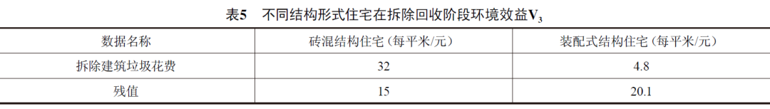 建筑垃圾產(chǎn)生量參考行業(yè)測算,民用房屋建筑按照每平方米1.3噸計(jì)算;存在回收利用的,在考慮綜合因素后按結(jié)構(gòu)類型確定為:磚木結(jié)構(gòu)每平方米0.8噸,磚混結(jié)構(gòu)每平方米0.9噸,裝配式建筑減少建筑垃圾約80%,每平米約0.12噸。在拆除回收階段建筑具有一定的構(gòu)配件殘值,按照相關(guān)標(biāo)準(zhǔn),對于傳統(tǒng)的磚混結(jié)構(gòu)房屋而言,殘值包括可回收利用的鋼筋和碎磚的價值共計(jì)15元/m2,裝配式住宅的一些預(yù)制構(gòu)件,或者鋼骨架在拆除后仍然可以回收利用,尤其對于預(yù)制鋼構(gòu)架,回收利用率可高達(dá)90%,按照行業(yè)的標(biāo)準(zhǔn),取40%作為材料的回收價值,通過計(jì)算,裝配式住宅的殘值為24.27×0.9×0.4×2.30=20.10元/㎡(表5)。