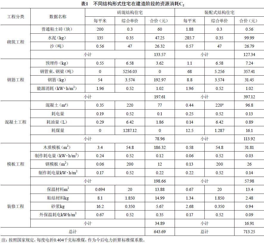 在建造階段的資源消耗(C2)主要包括各類建筑材料的消耗和能源消耗。按照砌筑工程、鋼筋工程、混凝土工程、模板工程、運(yùn)輸工程和裝修工程分類統(tǒng)計(jì),得出兩種不同建造模式住宅主要材料消耗量,不同結(jié)構(gòu)形式住宅在建造階段的資源消耗如表1所示。其中: