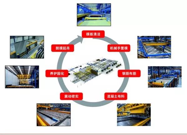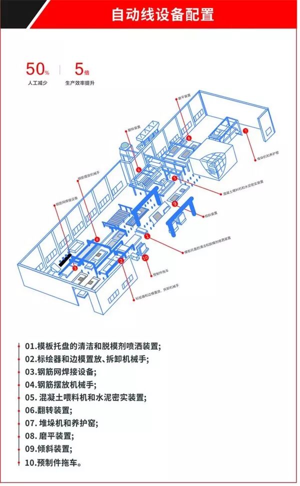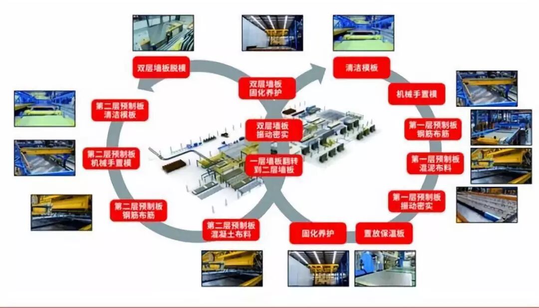 4、流水輪轉(zhuǎn)系統(tǒng):主要生產(chǎn)雙面墻體、雙面保溫墻體、預(yù)制樓板、實(shí)心墻體、預(yù)制外墻體及夾心墻體(三明治墻體)