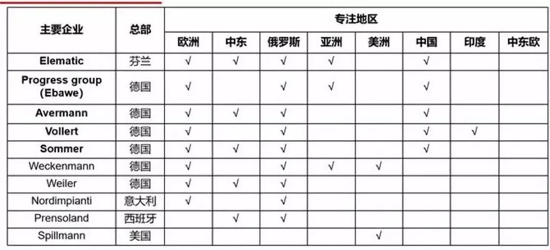 2、國外主要生產(chǎn)線供應(yīng)商有10家,生產(chǎn)線自動(dòng)化程度較高,其中Ebawe、Elematic、Vollert、Sommer、Avermann等,都已布局中國業(yè)務(wù),但市場(chǎng)份額很小。