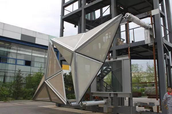 整個ADIC工程加工制造難度集中體現(xiàn)在2棟主樓的2098個遮陽傘的加工制造上。每個遮陽傘合攏時,外形酷似奔馳汽車標(biāo)志,由三角形鋁框、Y型支撐大臂、PTFE膜、鑄件、電機(jī)五大部分組成。在工程安裝中,造型復(fù)雜的底座牢固地扎根于墻體,三個大型臂狀錐管鑄件安裝在底座上,3支支撐大臂連接在錐管頂端,組成Y型,6個覆蓋PTFE膜的三角形鋁框兩兩固定在Y型支撐大臂上,中間由柱形電機(jī)連接,在電控系統(tǒng)的控制下,實(shí)現(xiàn)自動開閉。